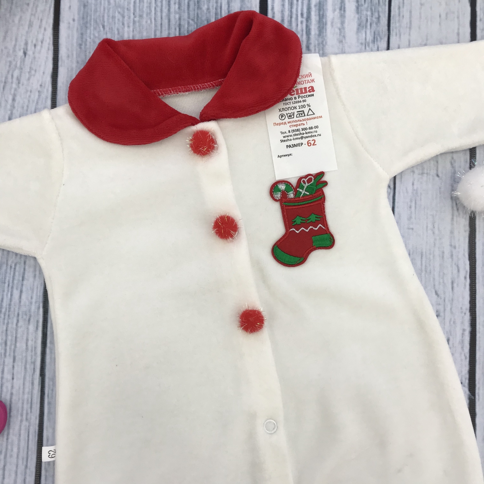 Теги: Купить оптом новогодний комбинезон от производителя. 244. Комбинезон Санта, хлопок 80% велюр 20% ПЭ, молочный 56,62,68 цена,отзывы официальный сайт "Стеша Северск"